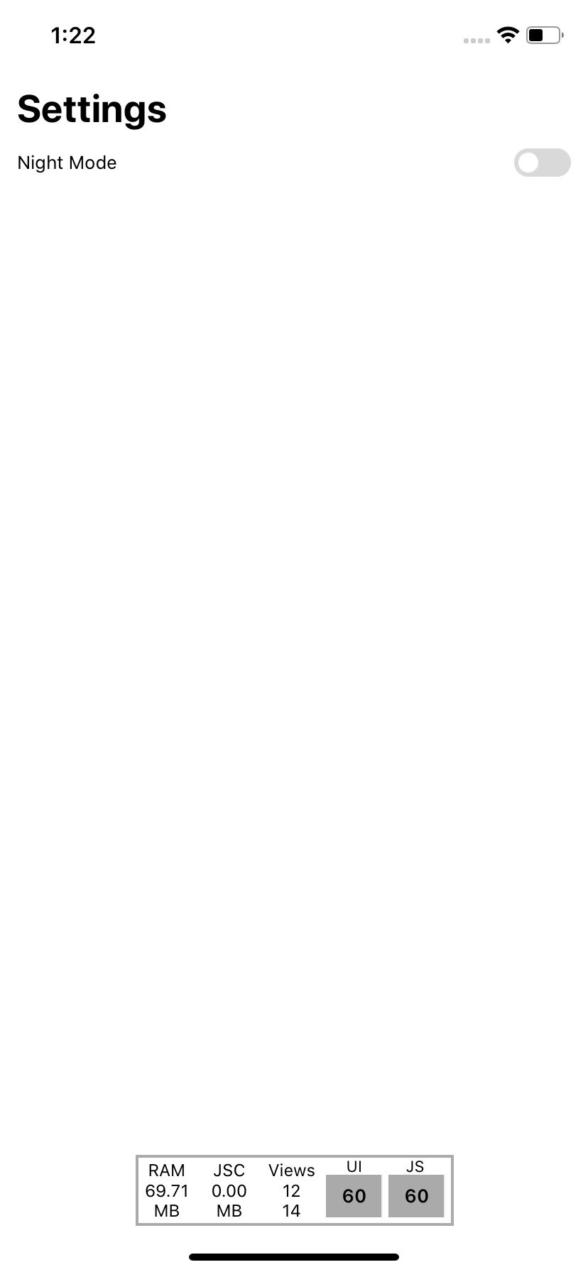 <Div bg="body" flex={1} px="lg">        <Text mt="2xl" pt="xl" fontSize="5xl" color="text" fontWeight="bold">          Settings        </Text>        <Div row mt="md">          <Div flex={1}>            <Text color="text">Night Mode</Text>          </Div>          <Div>            <ThemeSwitcher />          </Div>        </Div>      </Div>    </ThemeProvider>